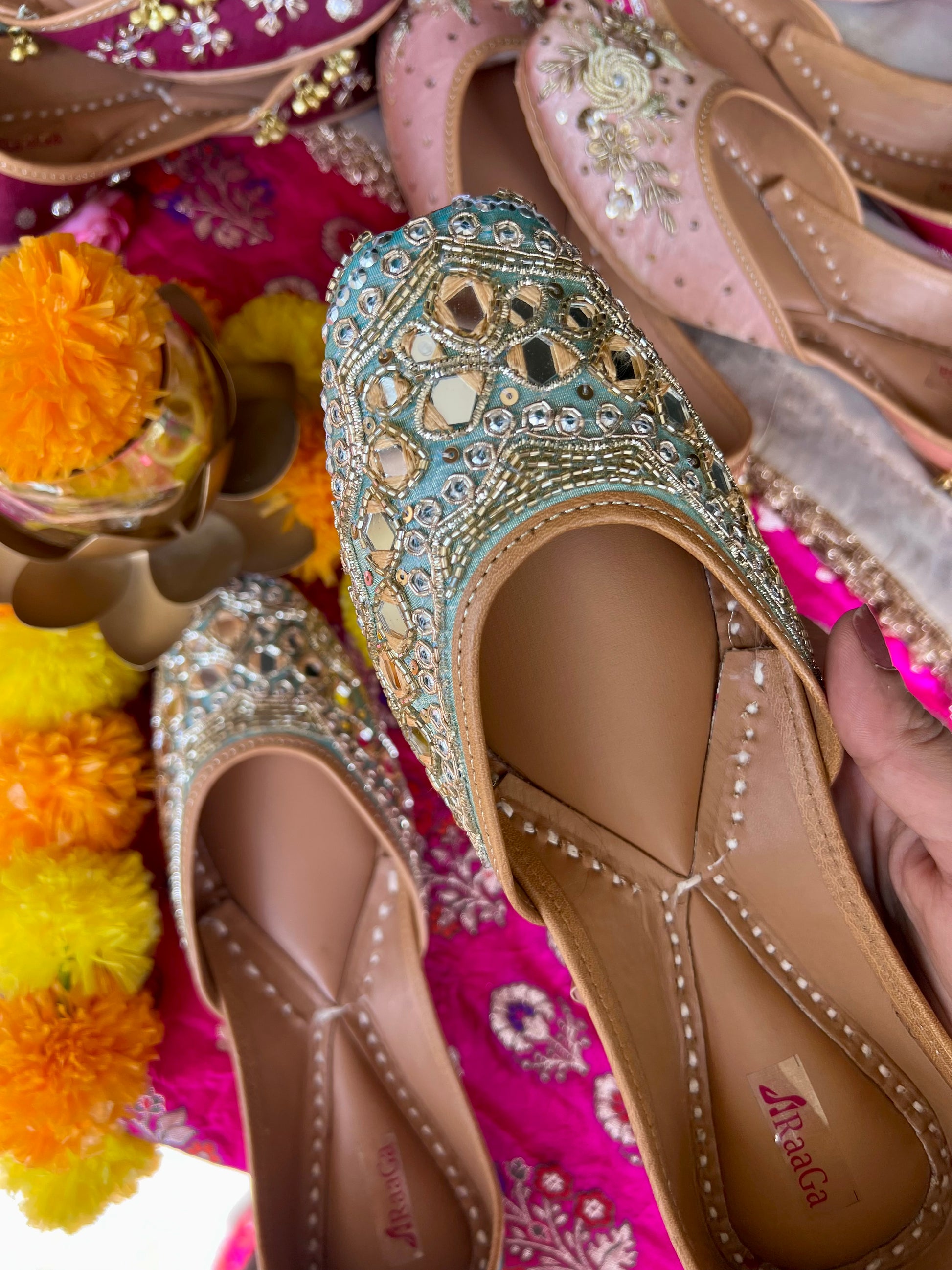 Aqua tones, mirror details, and signature Raaga comfort — a pair crafted to turn every look into a statement. These aqua mirror-work juttis shine the brightest when styled with pastel outfits.